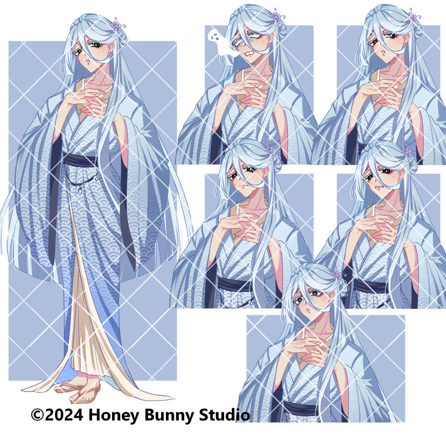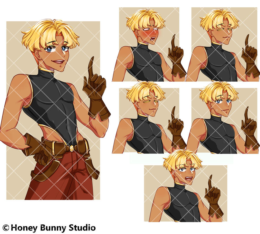 • Faceless base sprite with transparency (png file)• Pose of your choice• Eight expressions in separate files